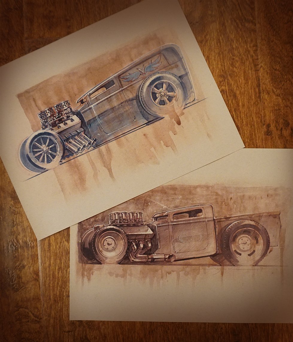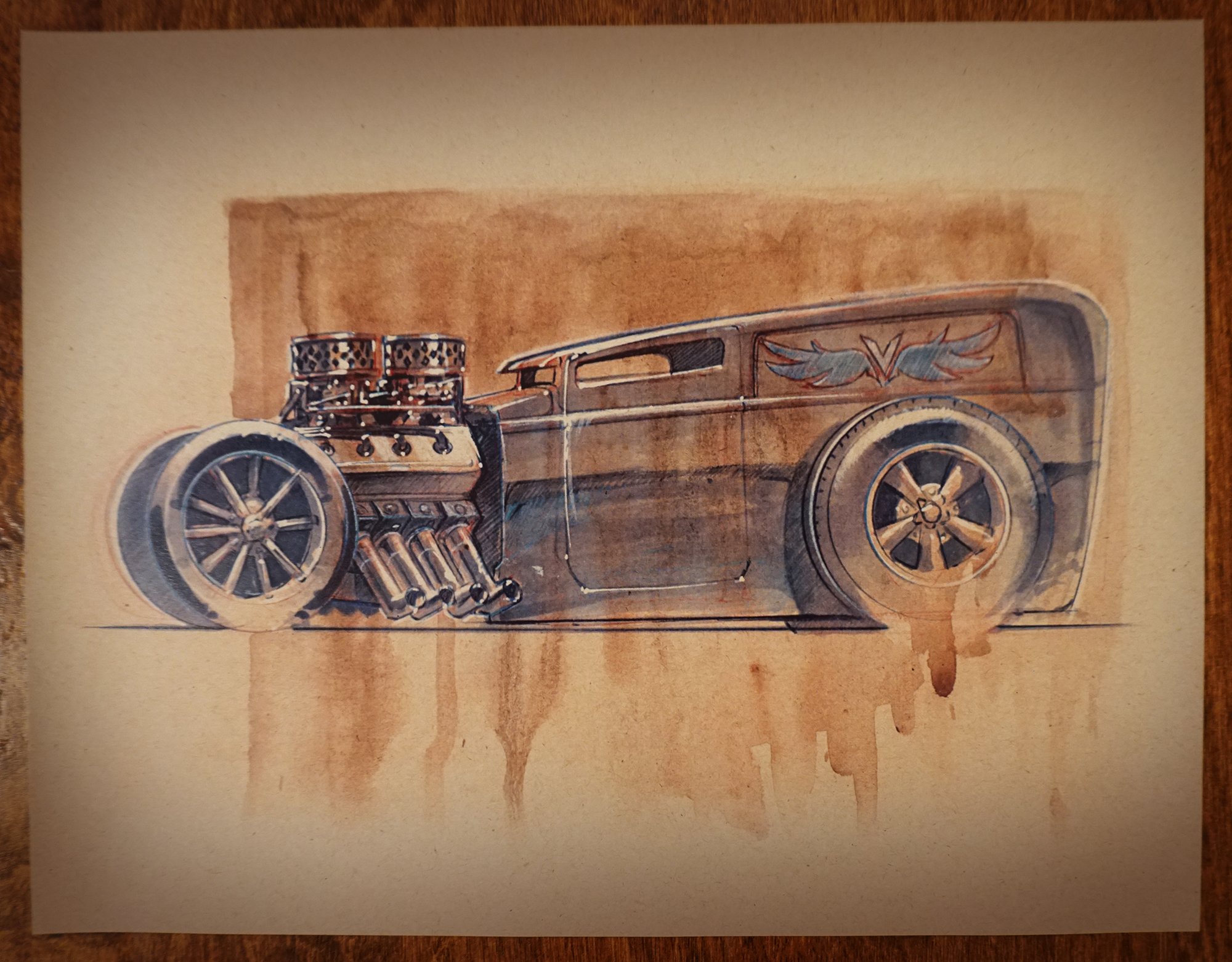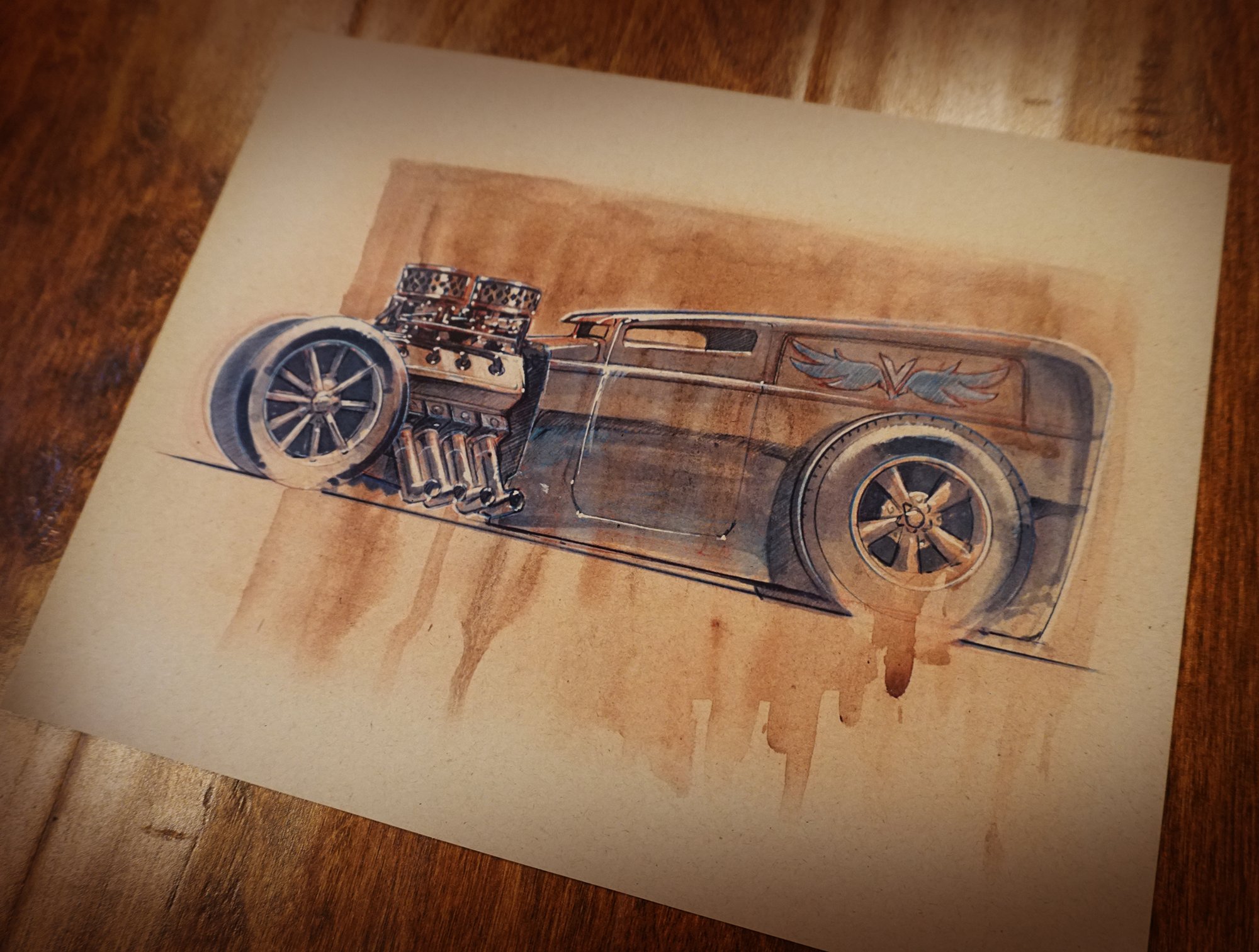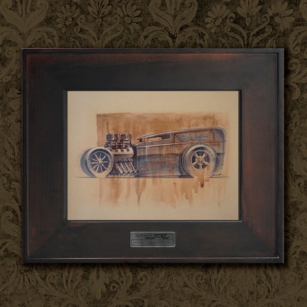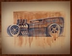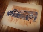 Hot Rod Sedan in all of its glory. Showing off its big engine. 8.5X11 print on sand colored paper. Originally done in watercolors, marker, and pencils and the print shows all the details of the pencil, marker and paint strokes. Great print for the man cave, Garage or an amazingly decorated kids room.