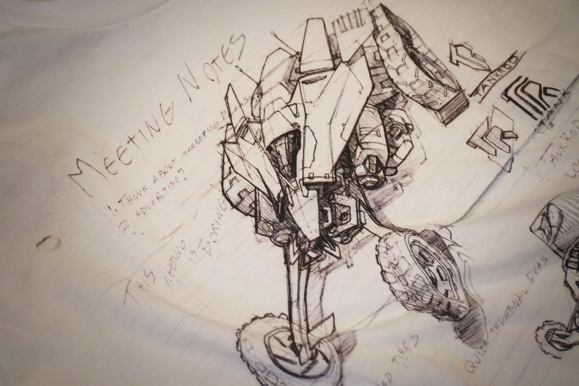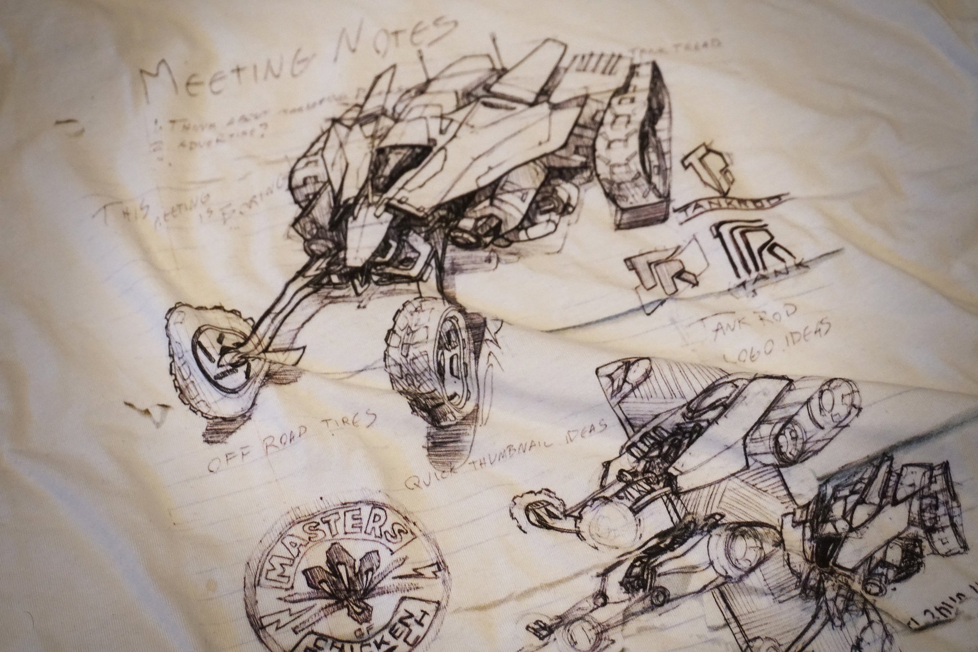 From my Inktober series of Tank Rods. This is a tribute to all the designers that know how to take great meeting notes. You can see the whole thought process behind the Tank Rods and display it on your chest.